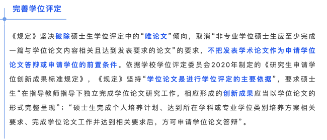 《规定》破除了硕士生学位评定中的“唯论文”倾向,取消“非专业学位硕士生应至少完成一篇与学位论文内容相关且达到发表要求的论文”的要求,不把发表学术论文作为申请学位论文答辩或申请学位的前置条件。《规定》坚持,“学位论文是进行学位评定的主要依据”,要求硕士生“在指导教师指导下独立完成学位论文研究工作,相应形成的创新成果应当以学位论文的形式完整呈现”;“硕士生完成个人培养计划、达到所在学科或专业学位类别培养方案相关要求、完成学位论文工作并达到相关要求后,方可申请学位论文答辩”。