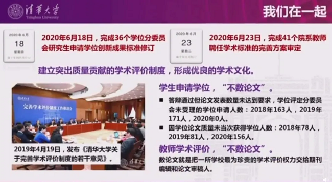 邱勇表示,2020年,没有一个清华学生因发表SCI论文数量不够,而无法申请学位。但,这并非放松毕业要求。相反,对数量要求下降,就意味着对论文质量要求的提升。邱勇认为,这是高校改革的目的所在:大学不能把学术权力,交给期刊编辑和审稿人。