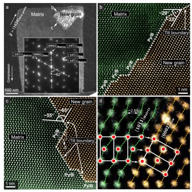 图 5:c轴压缩过程中形成的纳米级新晶粒核的边界结构。
