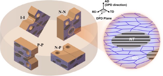 在本研究中,中国科学院金属研究所卢磊团队联合 中国科学技术大学、南京理工大学对由NTBs和NG组成的HNS Cu的各向异性断裂行为进行了系统研究。 基于定制设计的裂纹开口位移(COD)测量系统对具有不同裂纹平面的试样进行断裂测试,以定量评估其抗断裂性。NTB 通过充当不间断的桥梁来抑制裂纹打开,从而在 NN 和 NP 方向上提供有效的增韧;而在 P-P 和 I-I 方向,由于微裂纹在 NTB 和 NG 基体的界面处过早产生,桥接增韧不起作用。此外,N-N 和 I-I 方向的明显裂纹偏转有助于提高抗断裂性。在裂纹桥接和裂纹偏转增韧机制都被激活的方向 (N-N) 中发现的高强度和显著断裂韧性相结合,这意味着各向异性可能是增韧高强度的潜在策略纳米结构材料的关键方向。本研究以题“Anisotropic toughening of nanotwin bundles in the heterogeneous nanostructured Cu”发表在金属刊物Acta Materialia上。