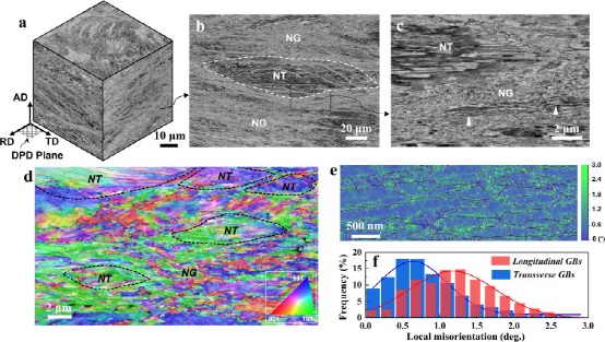 图 2.(a) 将SEM-BSE图像投影在立方体上,以在三个观察方向上可视化DPD Cu的微观结构。(二、丙)典型的横截面微观结构,以嵌入纳米颗粒(NG)基质中的束的形式显示纳米孪生(NT)。(d) 对横截面微观结构的详细TKD观测,该结构绘制为相对于DPD方向的反极图(IPF)图。(e) 根据从尼泊尔国家集团区域获取的传统知识数据的KAM地图。(f) 纳米颗粒纵向和横向GB附近局部偏向角的统计分布。