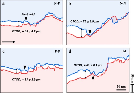 图 4.从CLSM 3-D拓扑中提取的相同裂纹路径剖面图,包括N-P(a),N-N(b),P-P(c)和I-I(d)试样的两个裂缝半部分,这些裂纹路径排列到与钝化预裂纹尖端合并之前的第一个空隙(由黑色三角形标记)的点。黑色箭头表示裂纹扩展方向,如下图所示。