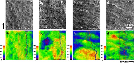 图 5.对N-P(a1),P-P(b1),I-I(c1)和N-N(d1)的宏观分形特征的扫描电镜观测。(a1-d1) 中的白色虚线表示从疲劳前区域到过载断裂区域的过渡。(a2, b2, c2, d2)分别对对应于(a1,b1,c1,d1)的区域进行三维CLSM观测,描绘了裂缝表面的高度变化。颜色表示以μm为单位的相对高度。分别沿着断裂试样的中线提取重建的裂纹剖面(红线和蓝线)。