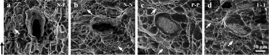 图 6.对N-P(a),N-N(b),P-P(c)和I-I(d)的微观分形特征的扫描电镜观察。粗糙的酒窝(由白色虚线勾勒)清楚地出现在中等酒窝的均匀背景上。此外,在中等酒窝之间还发现了少量细小的酒窝(用白色箭头表示)。