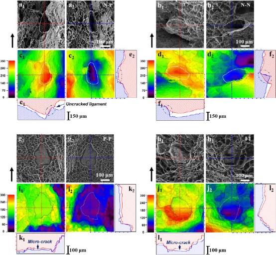 图 7.对N-P(a1,a2),N-N(b1,b2),P-P(g1,g2)和I-I(h1,h2)标本的两个破碎半部的断裂表面上的粗糙凹痕对进行SEM观察。(c1, c2, d1, d2, i1, i2, j1, j2)分别在对应于(a1,a2,b1,b2,g1,g2,h1,h2)的相同区域上进行CLSM成像,代表这些酒窝的3-D形态。颜色代表以μm为单位的相对高度。(e1, e2, f1, f2, k1, k2, l1, l2)从粗酒窝的中段提取水平和垂直轮廓,并精心匹配在一起。
